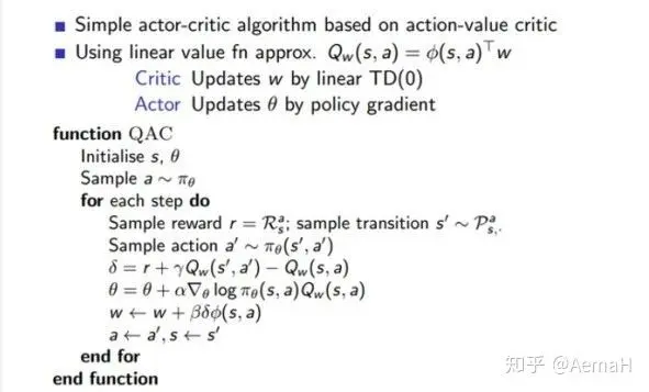 因为AC的方法,是在之前的策略梯度的方法之上 将其中的用于描述轨迹累计reward的项 转化为了行为价值函数 同时这里的状态值函数,接下来是一个简单实现的算法 行为值函数采用线性表达 于是更更新的过程中:critic通过近似TD(0)来更新ω,actor借助策略梯度更新θ,整体描述有: