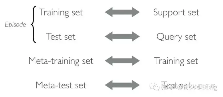 那么因为meta-train和train和乱,常常会混掉,所以大家约定俗成的把task里面的训练集称为support set,把task里面的测试集称为query set。而Meta training set和Meta test set分别直接称为training set和test set。