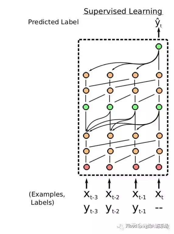 这个做法其实就是上图啦,我们直接把D_train当做条件输入到f中,那么这个f本身就变成一个meta network了。也就是条件神经网络实际上能够得到和上面的hypernetwork一样的意义。因为我们可以想,只要条件D_train变了,那么y_test肯定也就变了。所以这里就非常非常直接了。把数据全部输入进去,让神经网络自己学就行了,不外乎就是去设计一个合适的网络结构而已。那么,这里最最简单粗暴的网络结构就是SNAIL算法使用temporal convolutional network,也就是wavenet的架构: