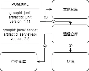 Maven会根据所写的坐标依次到本地仓库查询,如果有则引用,没有则到远程仓库中找。远程仓库又分为私服和中央仓库,私服一般为局域网,是公司组织自行搭设的平台,专门供公司内部人员下载,可以提供协同办公的效率。中央仓库为外网连接,在本地仓库中没有找到组件时,Maven会连接中央仓库,在其上面搜索下载。