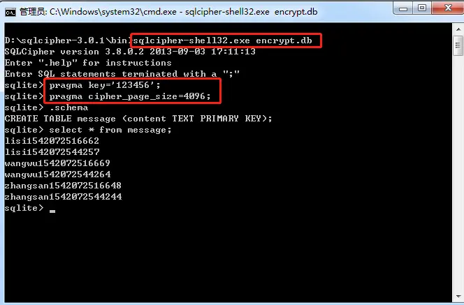 有时在命令行里面解密和查看数据不太方便,我们可以将加密db中的数据导出到一个未加密的db中,首先我们在命令行工具中使用sqlcipher打开encrypt.db文件,然后输入如下命令:
