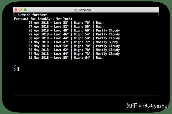 }现在当你执行 outside forecast --location "Brooklyn, NY" 后,你会看到未来 10 天的天气预测结果了。接下来我们再锦上添花下,当 location 没有指定时,使用我们编写的一个工具函数来实现自动根据 IP 地址获取所处位置。