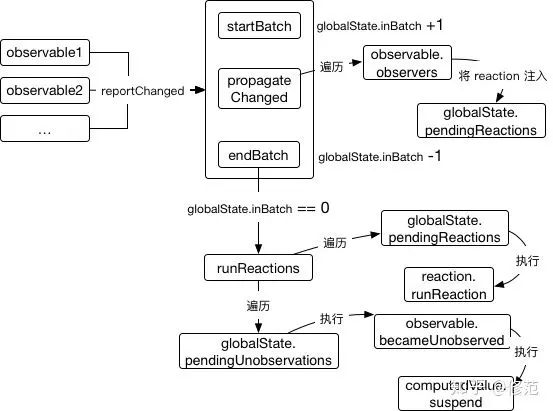 - observable.reportChanged 执行过程中,使用 startBatch, endBatch 函数将 propagateChange(observable) 包裹到事务处理周期中。mobx 中的事务通过 globalState.inBatch 计数器标识:startBatch 阶段,globalState.inBatch 加 1;endBatch 阶段,globalState.inBatch 减 1;当 globalState.inBatch 为 0 时,表示单个事务周期结束。事务的意义就在于将并行的响应式数据变更视为一组,在一组变更完成之后,才执行相应的衍生。