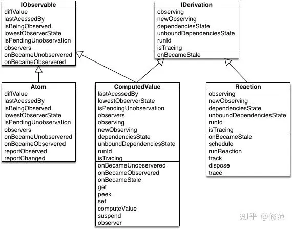 - observable: 响应式数据,最主要的特征是将数据变更信息上报给全局监听器。mobx 使用 IObservable 接口,Atom 类加以抽象。