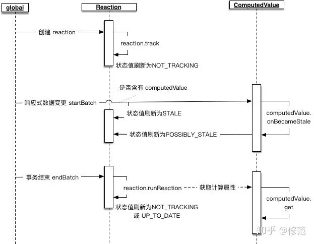 - 在一个事务处理周期中,首先通过 propagateChange(observable) 间接将 derivation 加入到 globalState.pendingReactions 队列中。该过程中通过调用 derivation.onBecameStale 方法实现。对于 reaction 反应,在事务执行期间,直接将 reaction 添加到 globalState.pendingReactions 队列;对于 computedValue 计算属性,间接将观察 computedValue 变更的 reaction 添加到 globalState.pendingReactions 队列。