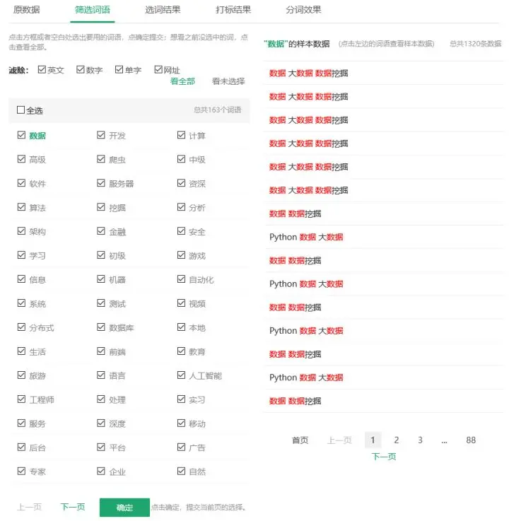 3. 进入我的任务,原数据都加载上来之后,点击“筛选词语”,筛选词语默认勾选全部,如果你不需要某个词,可以对其取消勾选。