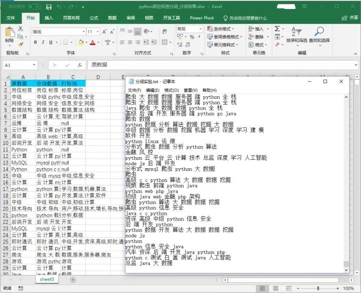 我用集搜客GooSeeker网络爬虫在拉勾采集了一些Python软件开发的职位信息,将其中“职位标签”一列提取出来做分词处理,通过上面的分词软件下载分词结果之后,将“分词效果”表中的“分词数据”复制到了txt文档中。