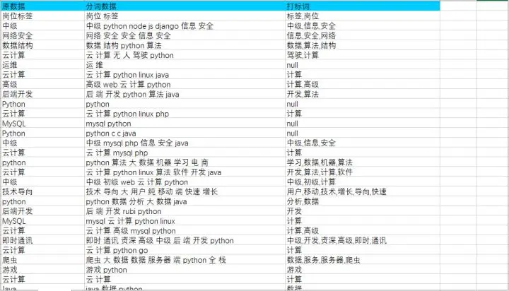 分词效果表可以看到原数据、分词数据与打标词。打标词对应文本分出的词语(去除无效词)。