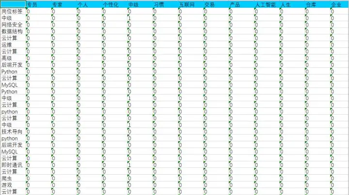 打标结果表是一张词与文本的矩阵关系表,左起第一列每行代表一个文本,词语在某个文本中出现一次,矩阵的值即标为1,如果未出现,即为0。这是文档的一种结构化特征表示,该表可用于做进一步的自然语言处理。
