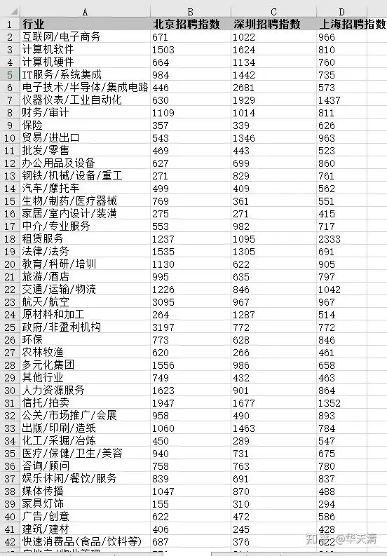 1、从箱体的宽度来看,上海整体的行业招聘指数最为集中,相对北京和深圳来说上海的招聘需求最平稳,侧面说明上海大部分行业发展都比较成熟,而深圳的行业招聘指数最为离散,相对来说深圳各行业水平层次不齐。