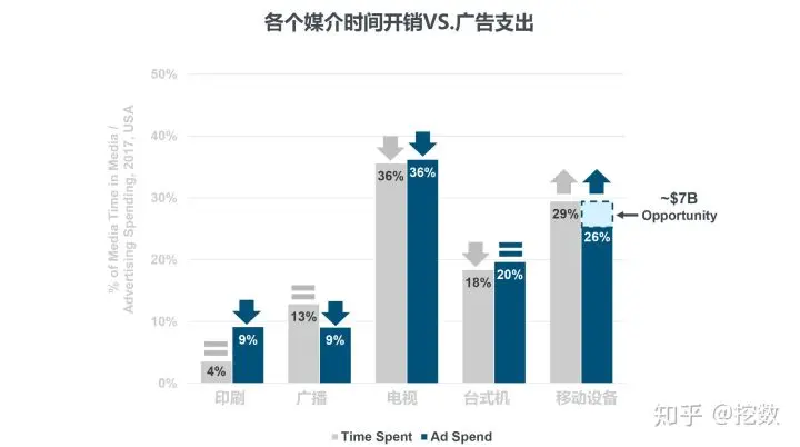 虽然电视的使用时长还是第1位,但已经呈下降趋势,正被第2的移动设备迎头追赶,上图还指出移动端的广告投放目前还有3%的增长空间。