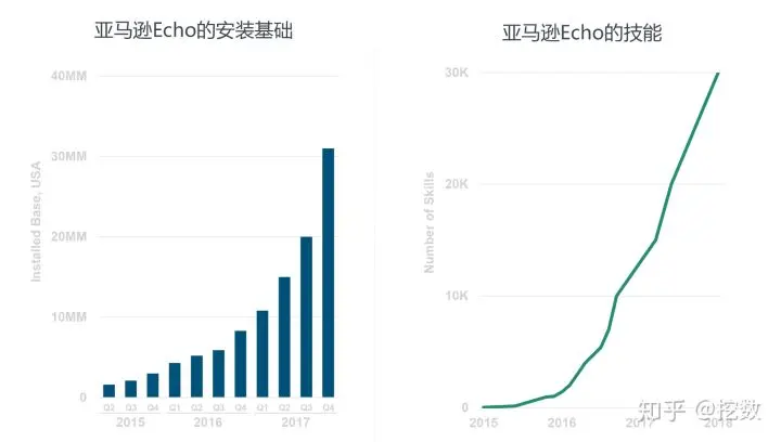 亚马逊智能音箱Echo装机量增长迅速,季度增长达50%,其技能数也指数级增长。