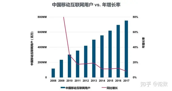 中国移动互联网用户数同比2016年增长8%,达7.53亿人,同时增长率在下滑。