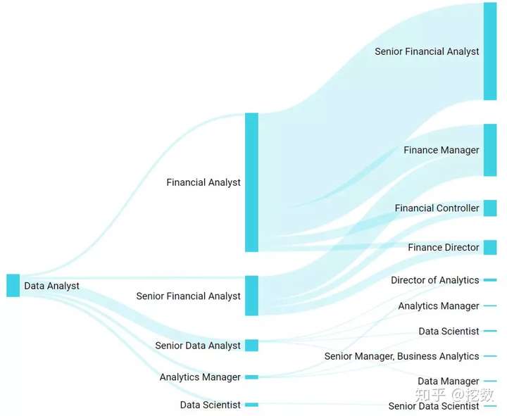 可以看到大头是往财务分析>财务总监这条路走,如果你有财务背景又想做数据分析,可以考虑往财务分析走,企业可以没有数据分析,但不能没有财务分析,财务是数据分析里边最普适的一个应用场景。