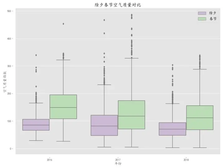 - 除夕活动(包括不限于燃放烟花爆竹)对AQI的影响(相邻箱线图中位数的变化)逐年减小。
