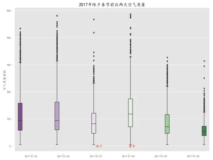 除夕和初一(上图春节特指初一)是春节假期中最重要的两天,我们通常会在除夕晚上12点前后燃放大量的烟花爆竹,其对空气质量的影响会直接反应在第二天的空气质量指数(AQI)中。