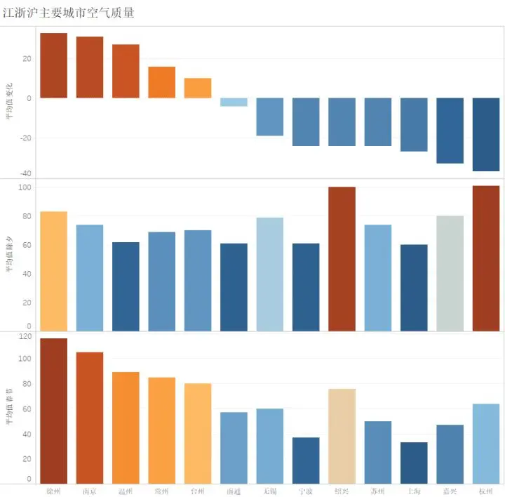 1、江、浙、沪三省市的主要城市初一AQI显著减小(下图蓝色)。江浙沪是劳动力输入大省,春节期间生产经营显著减少,并且不少城市禁止燃放烟花爆竹,因此初一AQI受烟花爆竹影响较小。