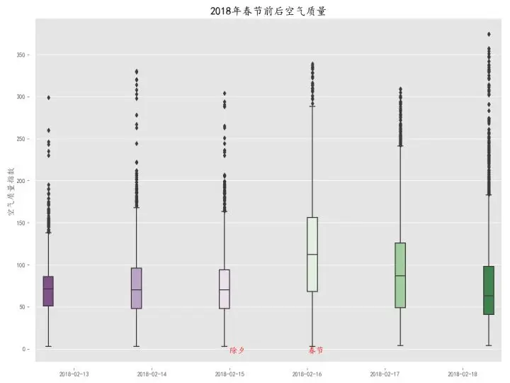 将时间拉长,可以看到除夕前几天空气质量有好转的趋势,初一空气质量显著变差,随后逐渐好转。这与春节临近生产经营活动减少、除夕初一燃放大量烟花爆竹、初二初三烟花爆竹燃放减少保持了一致性。