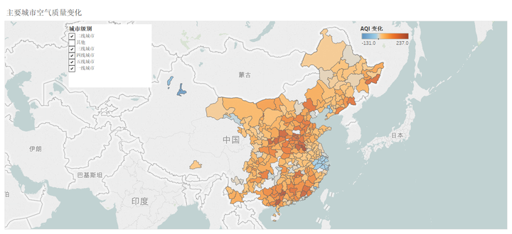 总的来说,西北、东北、沿海省份空气质量不错(蓝色),湖北、湖南、四川、陕西等空气质量较差(橙色)。