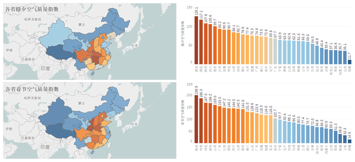 - 陕西烟花爆竹一次性燃放量最大,超过20%的城市AQI增加至少140。