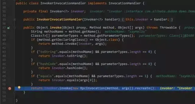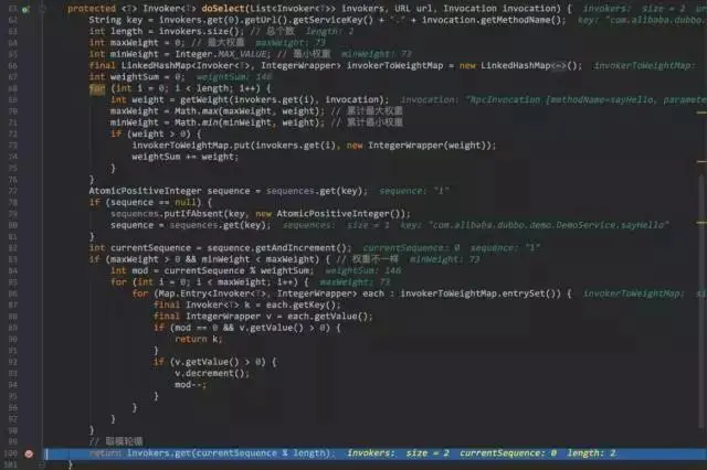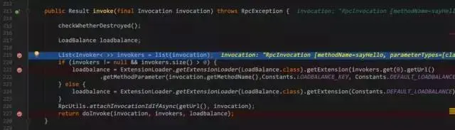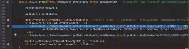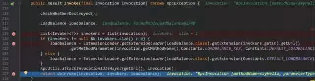 根据前面我们知道,现在已经有两个备选的invokers,但是究竟哪一个能执行,这个需要LoadBalance来决定。这里涉及到了一定的算法,后面我也会有一篇文章加以介绍。剧透一下,这个在2.5.4的版本中,这个算法还是存在一些小的bug,此时我们的位置是序号13。