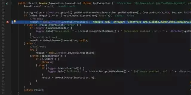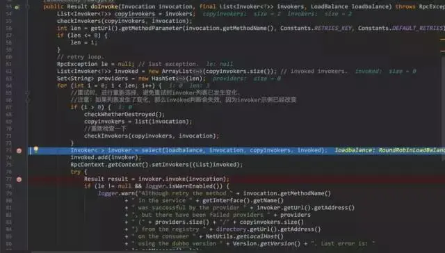 所以这个时候是到了FailoverClusterInvoker类,但是如果你配置的是Failover Cluster(快速失败),Failsafe Cluster(失败安全),Failback Cluster(失败自动恢复),Forking Cluster(并行调用多个服务器,只要一个成功即返回),Broadcast Cluster(广播调用所有提供者,逐个调用,任意一台报错则报错)他也会到达相应的类。