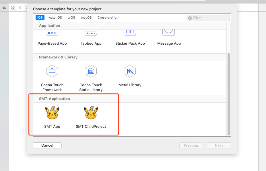 看到下面这两个“皮卡丘”了没,没错,这就是自定义模版之后的App工程创建和ChildProject子工程创建,以后创建的时候就可以直接选择这两个,不用在选择系统Xcode自带的了,那么怎么创建呢?