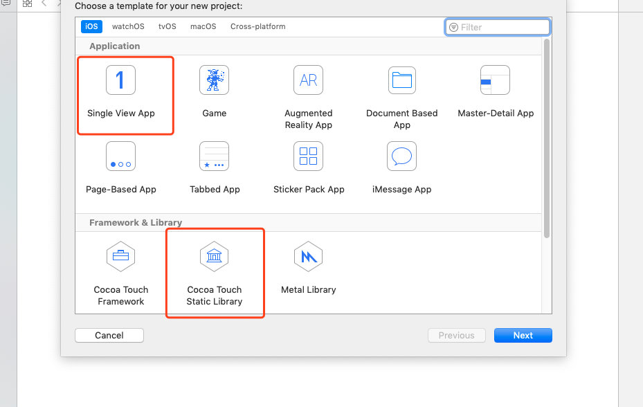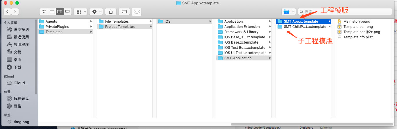 图中除了SMT-Application之外,其他的都是Xcode自带的模版,里面能对应上创建工程时操作面板上的所有图标。这里我们只以Single View APP为例说明。