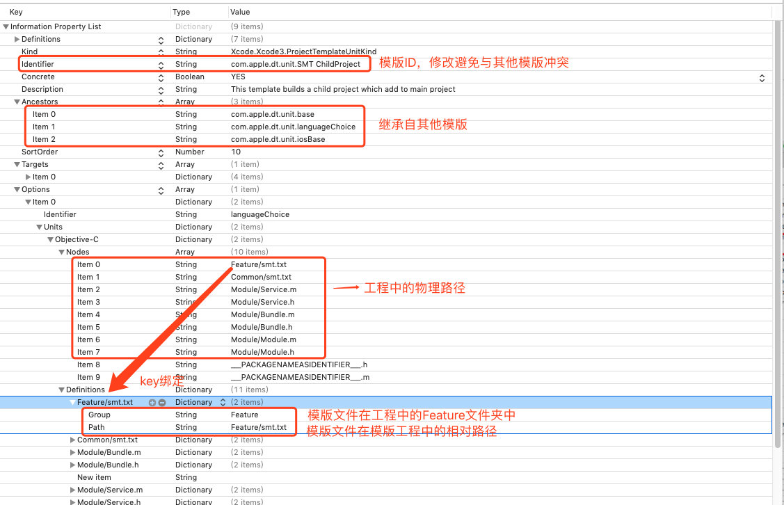 - Definitions.Xxx :这里Xxx就是上面的Node的值,其实一个字典类型,主要有两个键: Path: 模板文件(也就是要被拷贝的文件)所在工程模板中的位置 Group: 新工程中,这个文件所在的Group