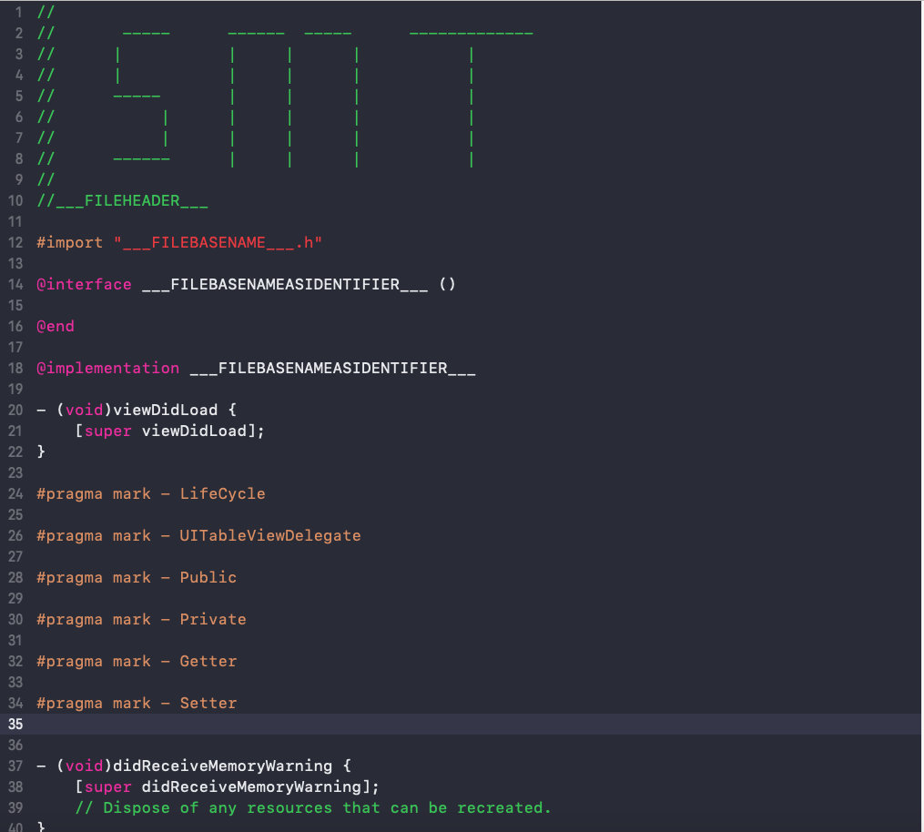 这里的模版是只写了几个#pragma mark,你可以随意定制一些代码规范以及想调用的方法都可以,看个人定制,只要你愿意,你甚至可以在每个文件里面写“我最帅”...haha