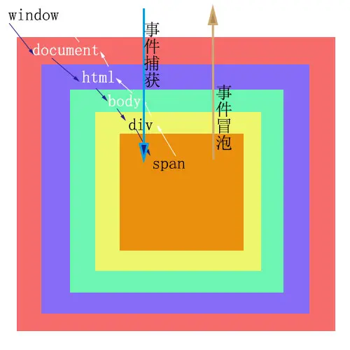 </html>给span标签绑定事件,就会有一个从事件源和目标之间的事件流,此例中,事件流的方向为window -> document -> html -> body -> div -> span -> 目标 -> span -> div -> body -> html -> document -> window ,整个事件流分为两个部分,以事件目标为界限,从window到span标签这个过程为事件捕获,从span标签回到window的过程叫事件冒泡。如图所示事件触发流程: