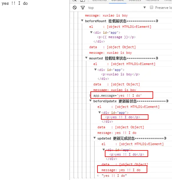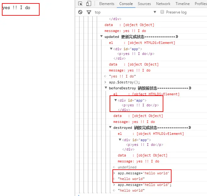 我们在console里执行下命令对 vue实例进行销毁。销毁完成后,我们再重新改变message的值,vue不再对此动作