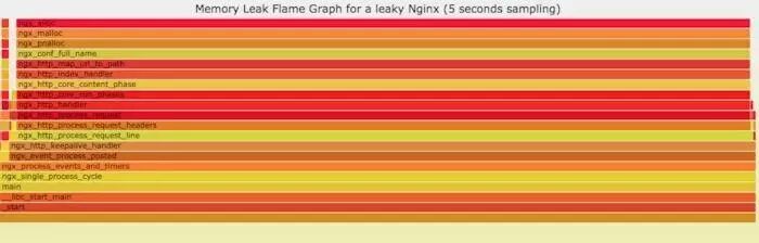 火焰图就是看顶层的哪个函数占据的宽度最大。只要有”平顶”(plateaus),就表示该函数可能存在性能问题。颜色没有特殊含义,因为火焰图表示的是 CPU 的繁忙程度,所以一般选择暖色调。