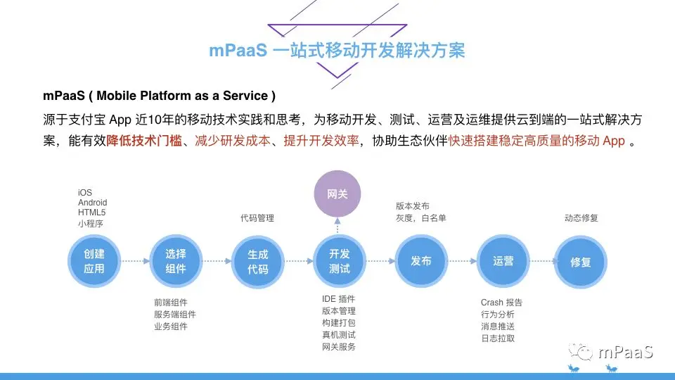 首先什么是 mPaaS 呢,mPaaS 全称是 Mobile Platform as a Service 。是蚂蚁金服独创的移动研发平台,它源于支付宝 App 近 10 年的移动技术实践和思考,为移动开发、测试、运营及运维提供云到端的一站式解决方案,能有效降低技术门槛、减少研发成本、提升开发效率,协助生态伙伴快速搭建稳定高质量的移动 App。