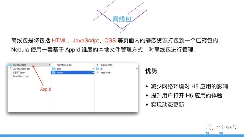 提升用户打开 H5 应用的体验:通过离线包的方式把页面内静态资源嵌入到应用中并发布,当用户第一次开启应用的时候,就无需依赖网络环境下载该资源,而是马上开始使用该应用。