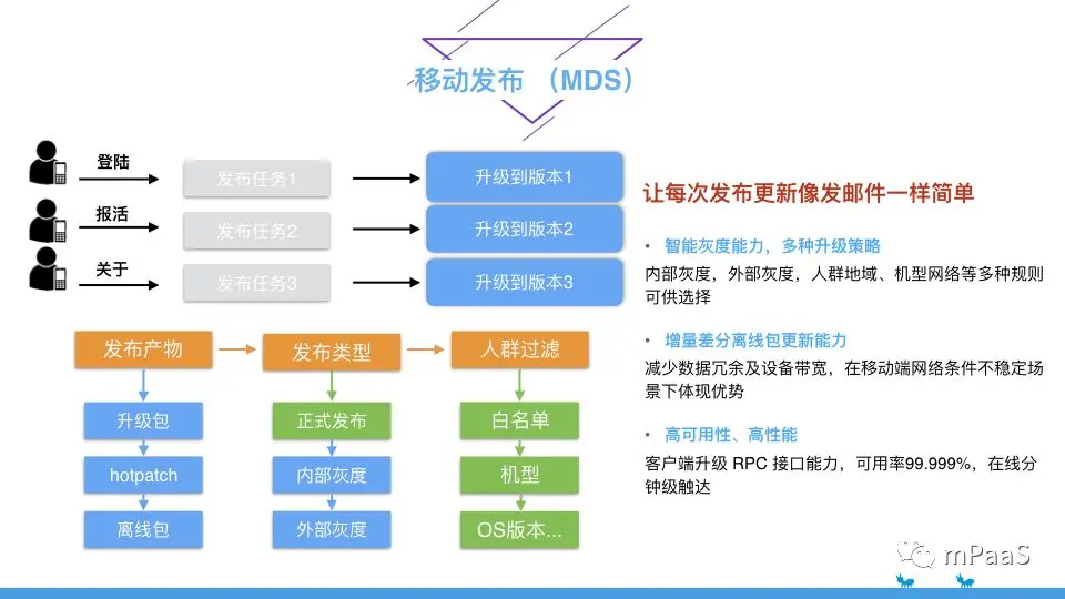 MDS 具有智能灰度发布的能力,可以通过内部灰度,外部灰度多重验证,保证在正式发布之前,发布的产品质量有充分的保证,同时提供多种升级策略,包括指定人群地域、机型,系统版本,网络环境等多种规则。对于离线包来说,更新离线包的下载对网络环境要求较高,包的大小越大,更新的成功率越低,在 mPaaS 中,我们采用增量差分的更新能力,减少数据冗余及设备带宽,在移动网络条件下优势明显。同时保证更新功能的高可用性,升级接口可用率达 99.99%,在线分钟级触达。