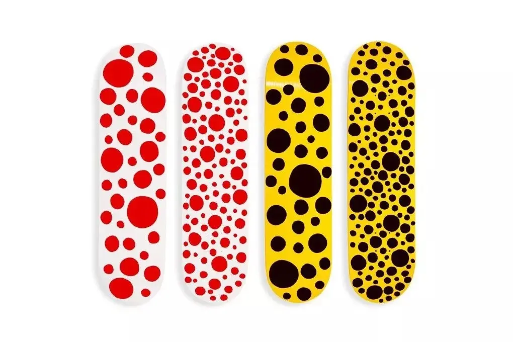 上段时间传出来,89岁的草间弥生与纽约的现代艺术博物馆合作推出了一个系列滑板,画板上采用了草间弥生的两个作品《DOTS OBSESSION》、《YELLOW TREES》,这事传遍整个艺术圈,轰动了整个潮流圈。但也不意外,毕竟她是“大牌收割机”,这些年LV、可口可乐、优衣库都乐意找她来合作。
