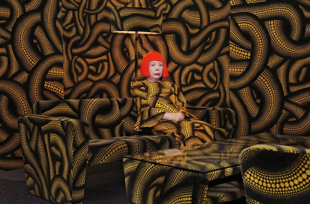 草间弥生曾说她想去谈一场精彩的恋爱,她是不老的,永远青春的。她的一生都奉献给了艺术。她坐在满是圈圈的小房间像极了宫崎骏创作出来的怪婆婆,给我的感觉就是个沉浸在游戏中的孩子。