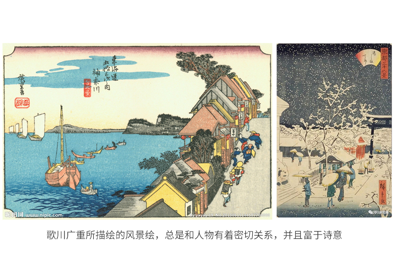 歌川广重所描绘的风景绘,总是和人物有着密切关系,并且富于诗意,所以也成为其作品特色,而且在风景绘的创作上,很多画师都是以系列来创作的,比方歌川广重比较著名的作品有10幅构成的《东都名胜》及55幅构成的《东海道五十三次》(最后一景分别画了三条大桥)我们来欣赏几张: