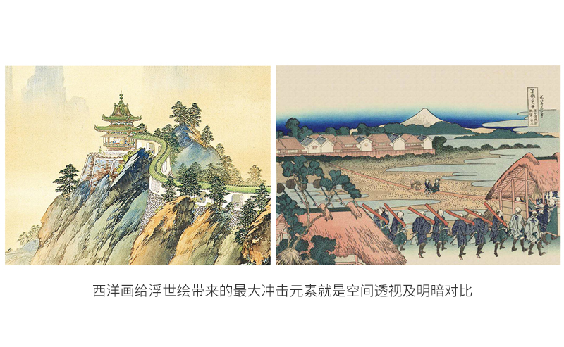 西洋画给浮世绘带来的最大冲击元素就是空间透视及明暗对比,我们知道浮世绘在美人画及役者绘阶段的画风其实都类似现今主流的扁平化风格,或者称之为“平涂”,平涂的特点是靠线条来形成关系,基本不存在很强烈的远近透视关系,而到了风景绘阶段,这些关系都逐渐出现了。