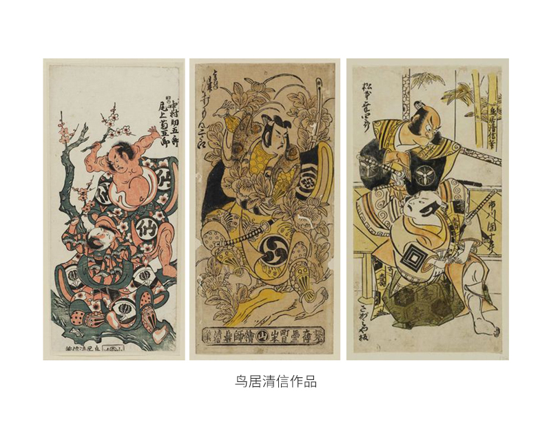 18世纪末到19世纪初是日本浮世绘的全盛时期,这个阶段占据主流的就是美人画及役者绘,役者绘除了名气最大的东洲斋写乐外,还有鸟居清信,鸟居的画风甚至被概括为鸟居派,因为他首先本身就是一名歌舞伎演员,所以他对役者绘有更独到角度的理解,他独创了一些描绘手法,比如“瓢簟足”和“蚯蚓猫”画法,以粗壮有力的造型配合变化多端的墨线勾勒,很多线条像蚯蚓一般,成为他这个派别的代表风格,他的后人还有诸多浮世绘名家,比方鸟居清倍及鸟居清长等。