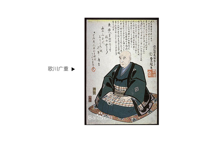 在风景绘的创作上,成就紧随其后的比他年轻三十七岁的歌川广重,歌川广重擅长很温婉的画风,他基本也伴随了风景绘的兴盛与衰亡,他原名其实叫安藤广重,但因为拜师画家歌川丰广,所以根据当时浮世绘界师徒艺名要传承的规矩,他更名为歌川广重,所以最初广重其实也是以绘制美人画及役者绘为主,风景绘的创作是在其师歌川丰广去世之后。