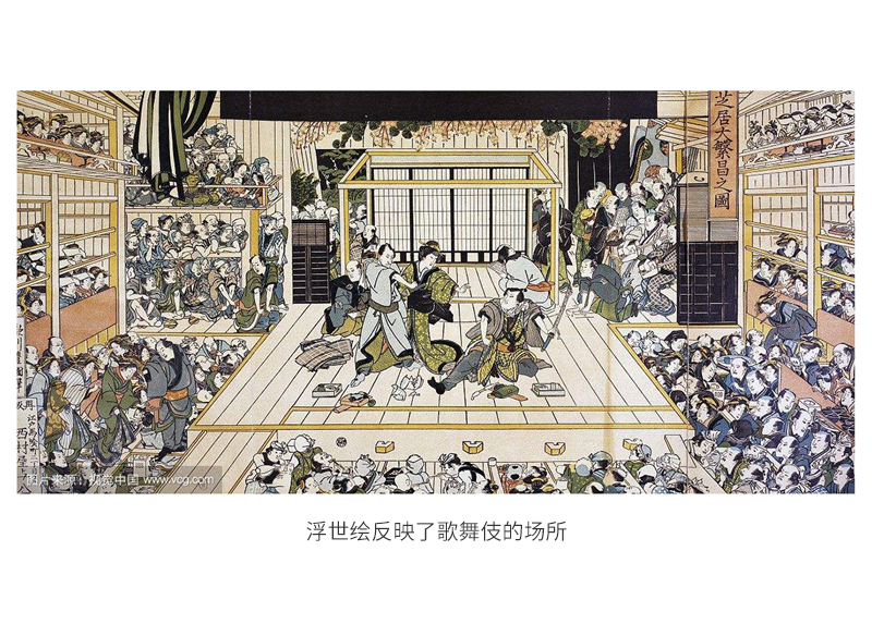 歌舞伎这种形式始创于1603年,正是德川家康在江户(今东京)开创幕府的第一年,当时京都有个出云神社,其中一名叫啊国的女巫很喜欢舞蹈,所以独创了一种载歌载舞的形式在街头为平民表演,而且啊国当时常以女扮男装的方式出现让大家感觉很新奇,她这种形式慢慢随着时间推移,变成集体歌舞,而且随着江户经济日渐繁荣,歌舞伎的场所也越来越多,成为大家茶余饭后的消遣去处,比方下面这幅浮世绘就描述了这个场景。