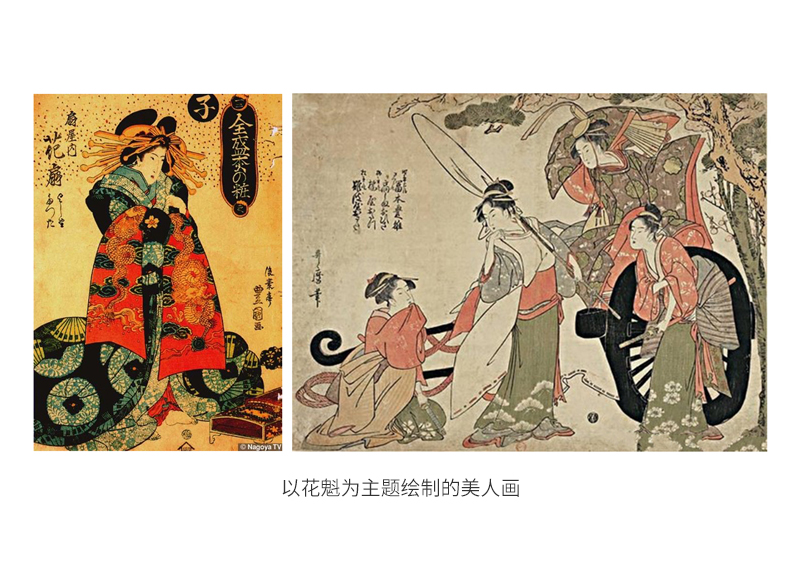 花魁的意思是指头牌,可以理解为一个茶屋(类似中国的青楼)最受欢迎身价最昂贵的游女(日本对妓女的称谓),花魁一般需要熟习歌舞和茶道,而且普罗大众一般难以一睹芳容,也正因为如此,为浮世绘画师提供了无限商机,比方很多浮世绘出版商就将作坊设立在吉原,签约的画师也长期驻点吉原,方便随时可以进行美人画创作,画中的花魁都是真有其人,而且画上会签上其真实姓名,有点类似当代明星写真的概念。
