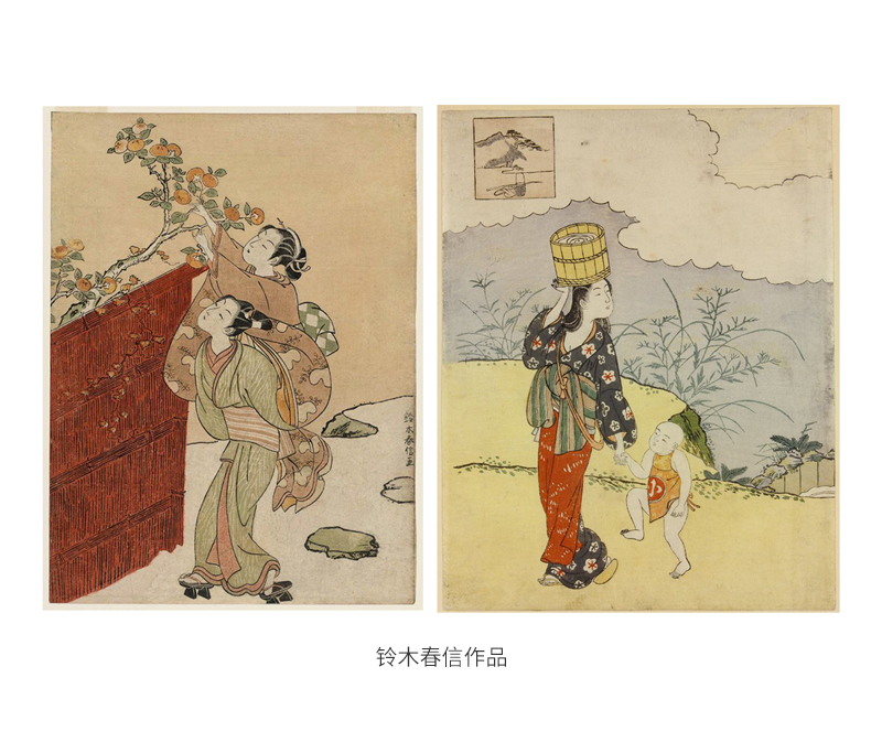 其实除了描绘吉原花魁外,美人画的取材也有来自民间的年轻美丽女子,又或者取材一些古典和歌,日本的和歌类似中国的诗歌,和歌由古代中国的乐府诗经过不断日本化而发展形成,和歌包括长歌、短歌、片歌、连歌等。比方浮世绘历史上一位大咖铃木春信,他的绘制题材就不局限于花魁,铃木生于1725年,他笔下的美人画对比吉原花魁一类,显得一股清流,多数主角清纯柔美,活像生活中的东邻少女,我们来欣赏几张: