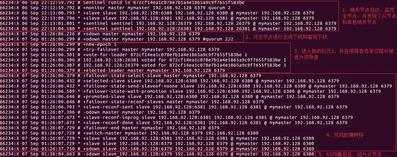 通过上述几个关键概念,可以基本了解哨兵的工作原理。为了更形象的说明,下图展示了领导者哨兵节点的日志,包括从节点启动到完成故障转移。