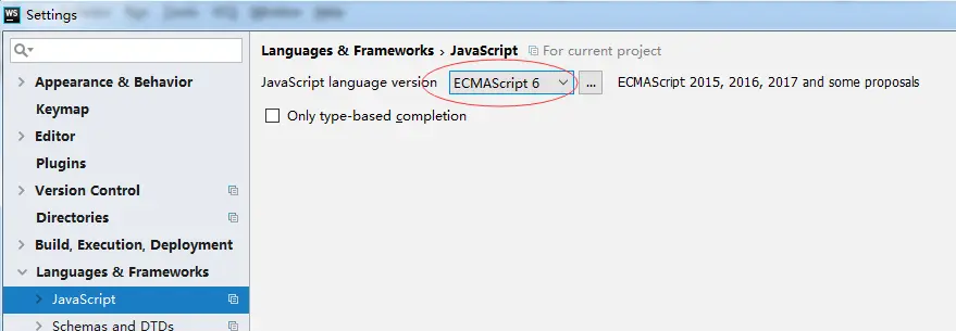 注意: 上述示例使用了 ECMAScript 6 语法,所以在 webStorm 中需要进行设置(Setting → JavaScript → 选择 ECMAScript 6 )否则会出现红色波浪线哦: