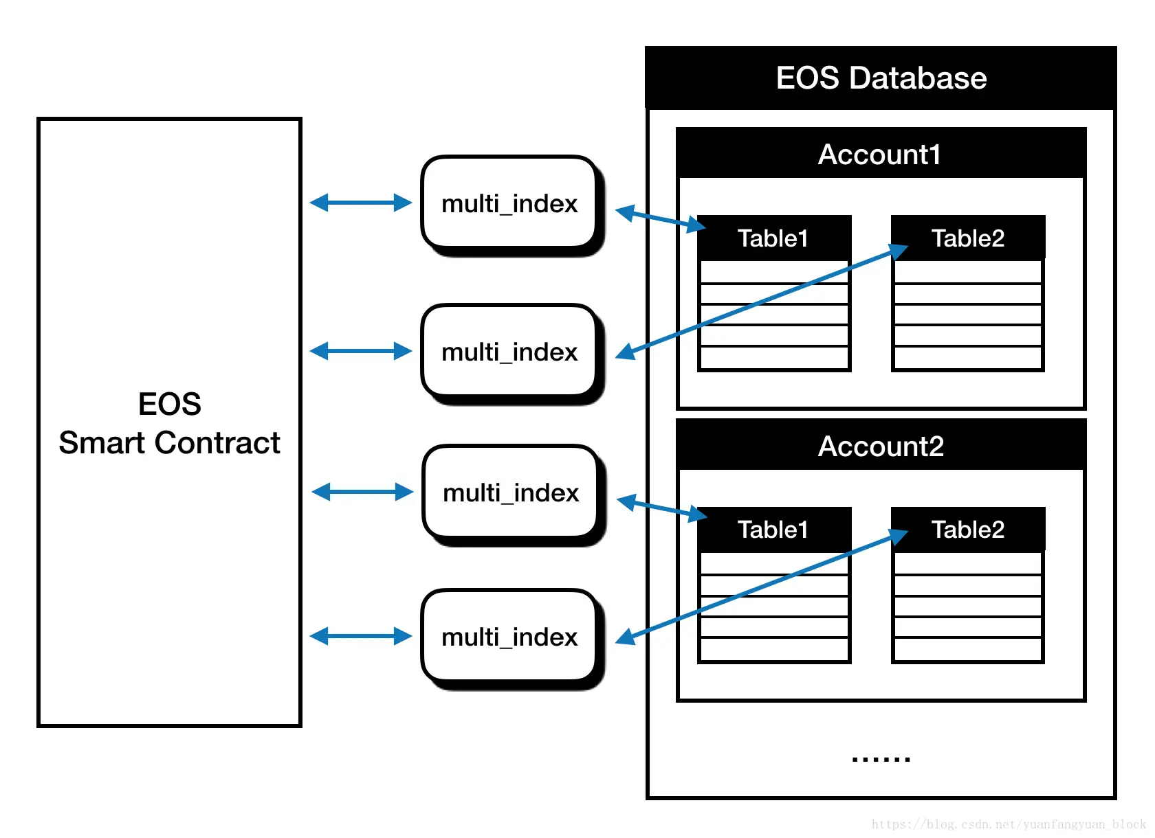 为了方便智能合约与 EOS 数据库的交互,EOS 仿造了 Boost 库中的 Multi-Index Containers,开发了 C++ 类:eosio::multi_index(以下简称 multi_index),中文可以叫做多索引列表类。