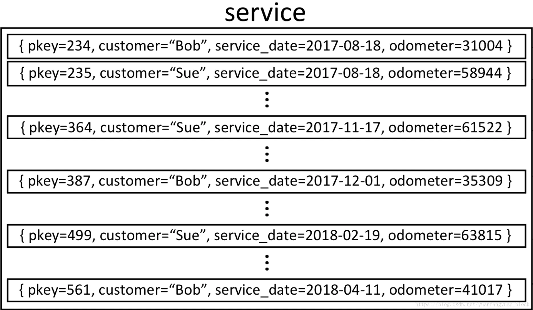 在传统数据库中,需要建立一个 4 列的数据表,用来储存每个用户的这个 4 个数据,而multi_index的每个数据表只有一列,只存储每个用户的 service_rec 整个结构体即可。下图为multi_index数据结构。