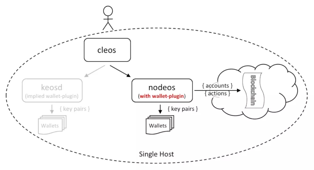 如上次文章所讲,我们建立的本地测试网络如下,并没有单独的 keosd 钱包,而是使用了 nodeos 程序里的钱包插件。